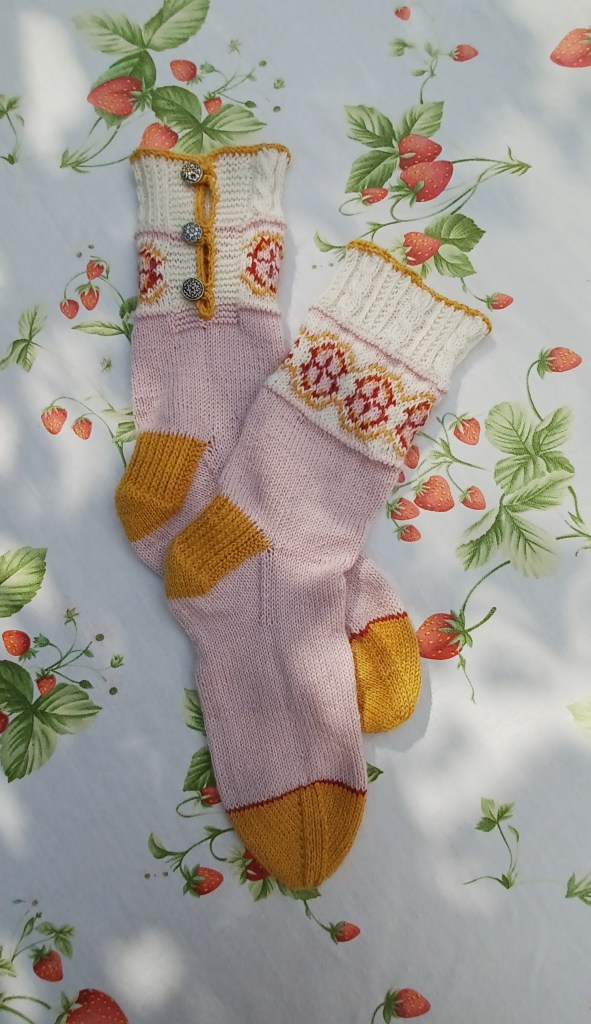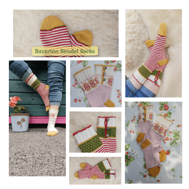 Along the cuff trails the “Zöpfchentour” (or “cable run”) and “Streifenfläche” (or “striped plain”) from the area of Sulzbach-Rosenberg. The traditional “coverlet” over the calves is indicated by ribbed rows, which separate the designs. The classic flower design in stranded colourwork was simplified for a more graphic look. The rest of the leg is worked in plain stocking stitch with pops of colour on the heel and toe for a quick, easy “home run”. They are completed with a button closure inspired by detailed Lederhosen edging in the form of contrasting, looped i-cord. As an alternative, try the Bavarian Christmas Strudel variety!
