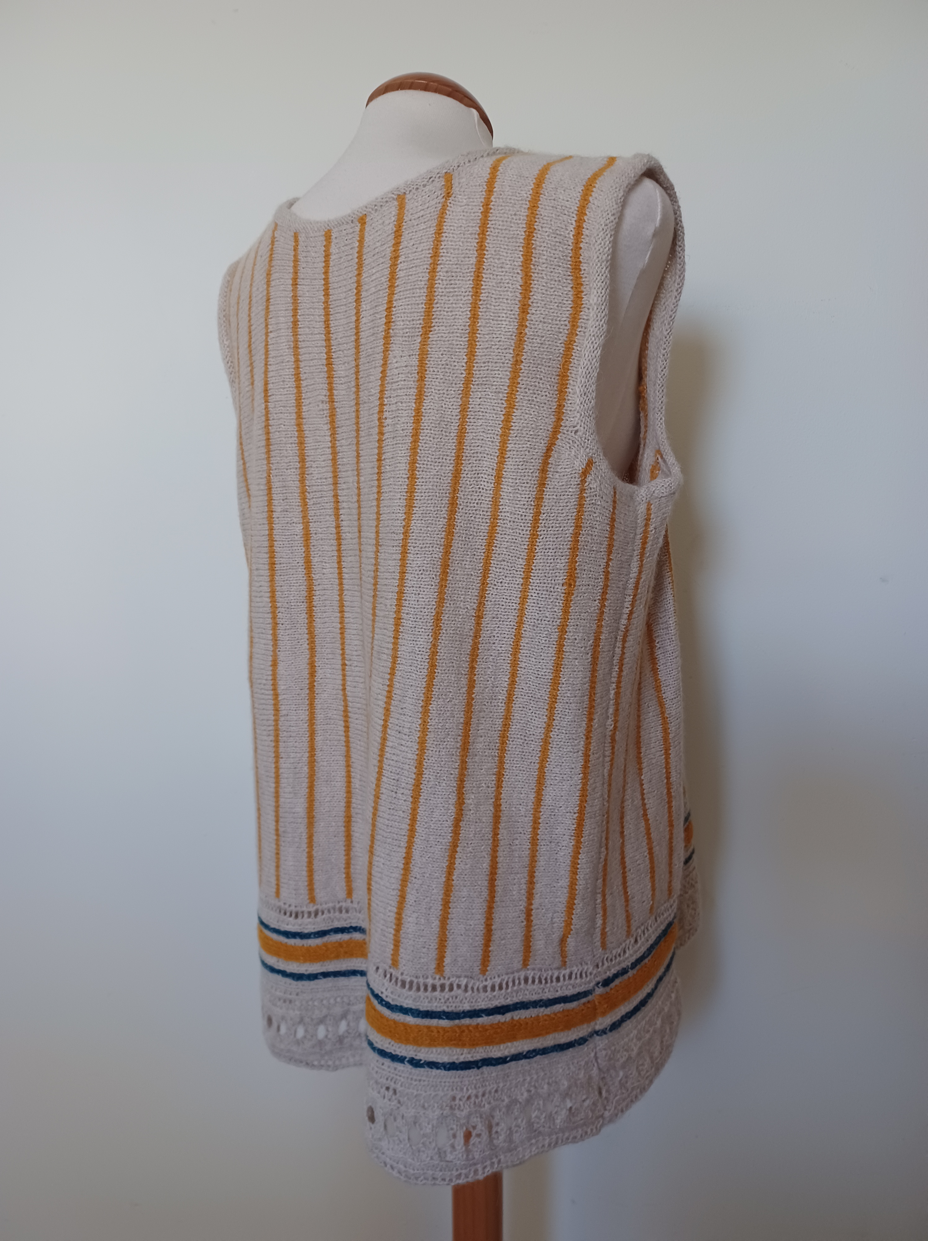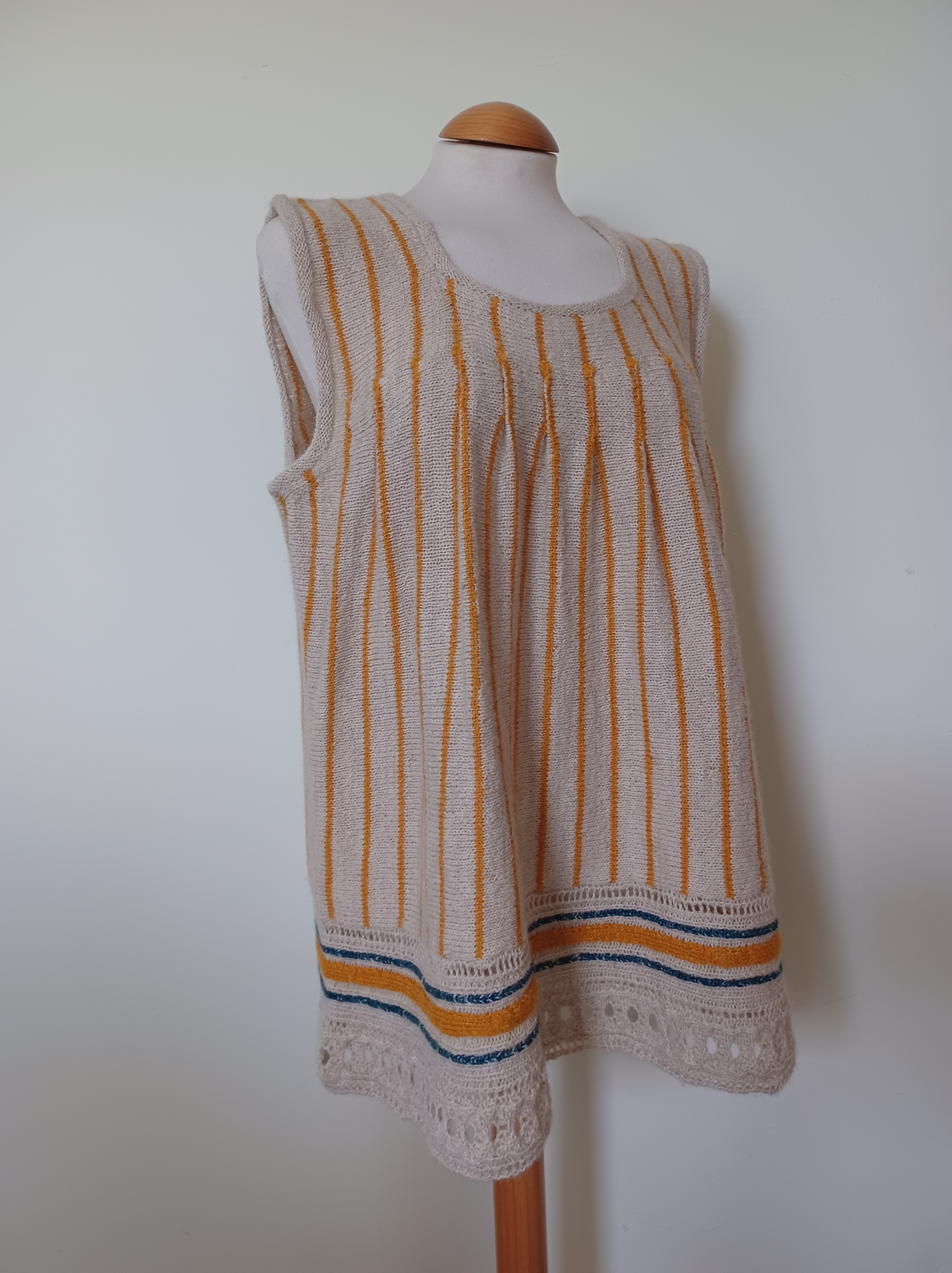 This piece has a vertical construction and is knitted from side to side. Both the front and back pieces are knitted in one piece with the lace edging forming part of the knitted fabric. The details in this garment have some tailored elements and this is not a “quick knit“. You will learn to master traditional German lace knitting techniques, use stranded color work, sew your knitted pleats, and add blue details by using the embroidered duplicate stitch and the golden “Wheat stitch” to embroider the pleats.