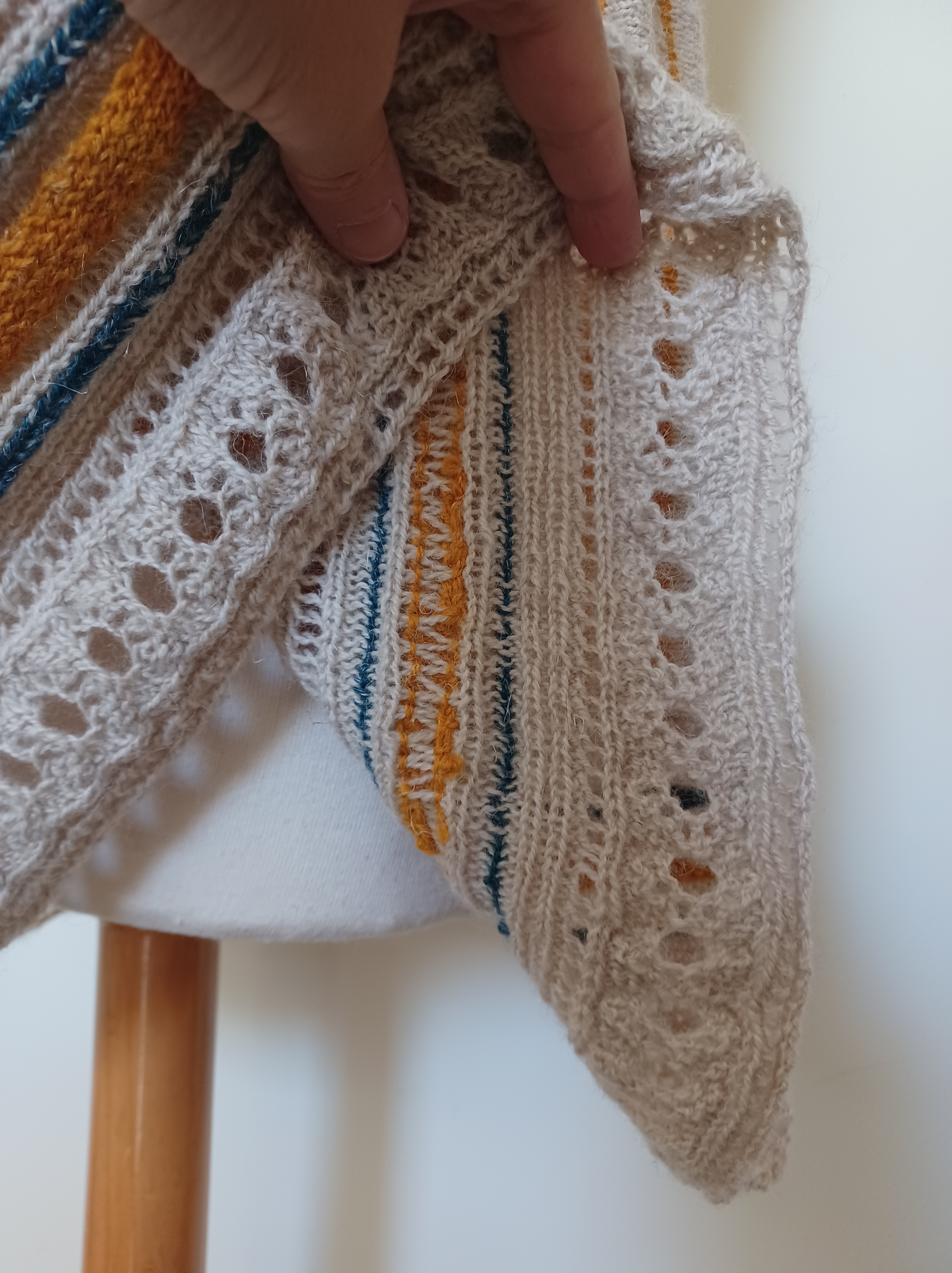 I used a linen/wool mix with a nice rustic texture. Only a small amount of blue is needed, and can be easily replaced with scrap yarn in a comparable thickness.