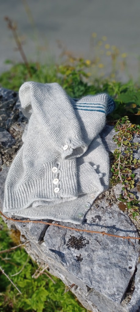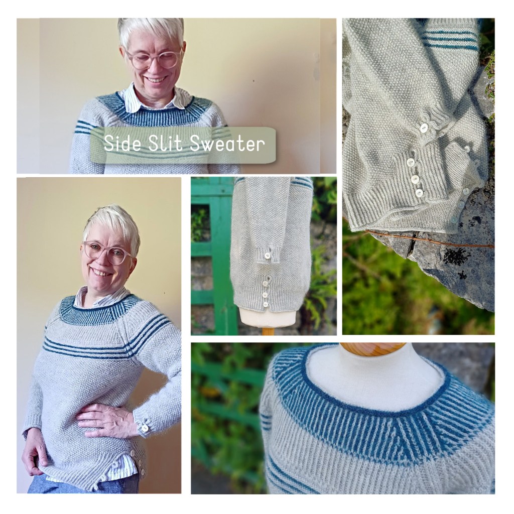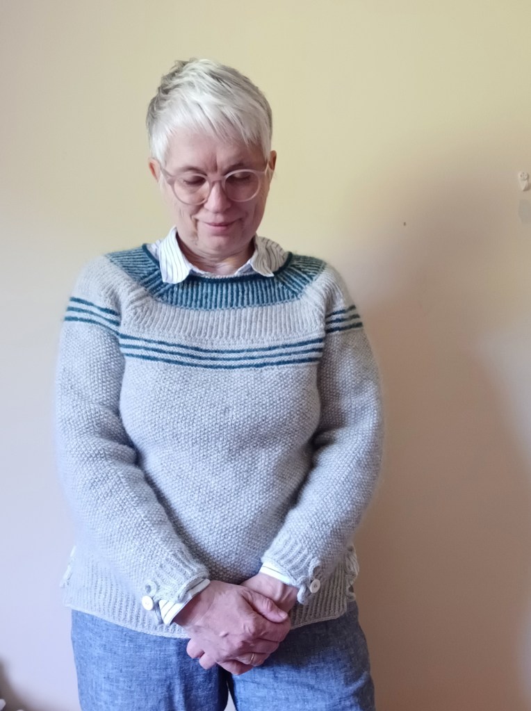 The sweater has a comfortable raglan construction and is knitted top-down. The fabric combines 3 different textures: vertical and horizontal ribs and moss stitch, some of which are arranged in stranded colour work. 2 yarn strands are held together apart from the i-cord, which surrounds the hems and is looped into button holes along the hems. I added a doubled curl edging to the collar and white horn buttons for the loop closures, which are backed with small mother-of-pearl buttons to avoid pulling. The sweater can be worn with open or closed side slits.