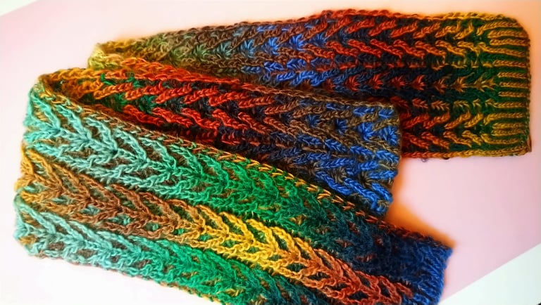 The scarf has a real luxurious feel to it – the Brioche stitches have ultimate texture with a beautiful “squishy” softness, and hold their shape extremely well because of the depth of the stitch. When the fabric is being pulled or folded, the colours blend beautifully and the many combinations create a huge colour palette. Remember that Brioche is reversible, so you can wear your scarf or cowl on both sides, and the edges don’t roll!