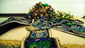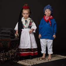 Costumes consist mostly of natural wool, linen and cotton fibres in rich, earthy colours – in actual fact, colour is one of the most meaningful parts of the costume among the many coded traditional meanings. Simply by the colour present in a garment was it possible to determine age, marital status, and occasion. Statement pieces like chest cloths, borders along hems, collar bands and sock straps can feature colourful embroidery, beading and metal wiring, while base fabrics are generally of one rich colour with a symmetrical repeat pattern for embellishment. Pieces are heavily layered and combine to create a collage of rustic, heavily pleated and folded fabrics in strong colours of all weights from see-through lace to heavy woolen cloth. Instead of coats, heavy woolen cloth was worn to cover the upper body from head to hips and closed in the front with 2 large clasps.